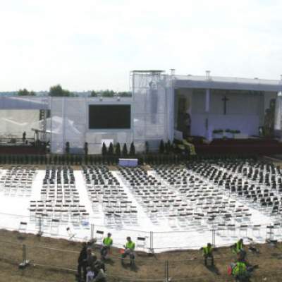 The design of a site for 50,000 visitors close to Stará Boleslav covered access roads, a turfed area divided into sectors, the central and side stages including decorations, sound distribution, and stage lighting.