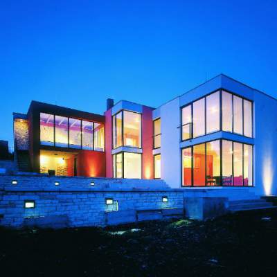 The family house construction estate consists of two minimum lits along K Chabům Street at the southeast edge of Třebonice. The estate is slightly declined southwards, from the communication and neighbouring development direction. The land configuration was an inspiration for the concept of the house with the compact walls northward and eastward, towards the communication, and open, glazed facade (without window sills and arches) southward and westward, were is a beautiful view of the landscape. The house position near the north and east border enabled to create compact area for habitable garden in the southern part of the estate, which is out of sight from the street. The two-storeys house consists of three parallel volumes, which follow the slope contour with communication. The ground floor disposition meets inhabitants' living and social requirements - the essential part of the ground floor is a "living hall" with several direct entrances to the garden. A kitchen, made of different material, is "inserted" into the "living hall". The ground level floor follows terrain sloping tendency, it allows direct entering into the garden terraces also from other rooms. On the first floor in the northern part, there is a bed-sitting room; the remaining part consists of a workroom and a bedroom with a bathroom. A roomy hallway with the staircase is in the disposition center and has a ceiling lighting. The used materials - ceramic blocks Porotherm and reinforced floor slab with concealed girders. All glazing is in system aluminium sections. The outer surfaces - scratched plaster with colour coating; forge and plumbing elements - graphite coating + awnings, outer staircase - architectural concrete. An external leaf, made of "havlovický" sandstone, is added to the garden support walls and to the winter garden wall. The interior materials - solid oak wood, natural stone, smooth coat with colour waxed coat in places, ceramic glazed mosaic - the combination of white and rich color surfaces.